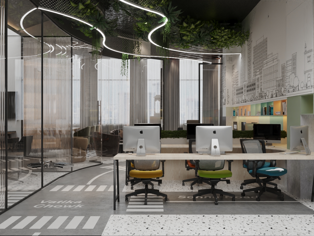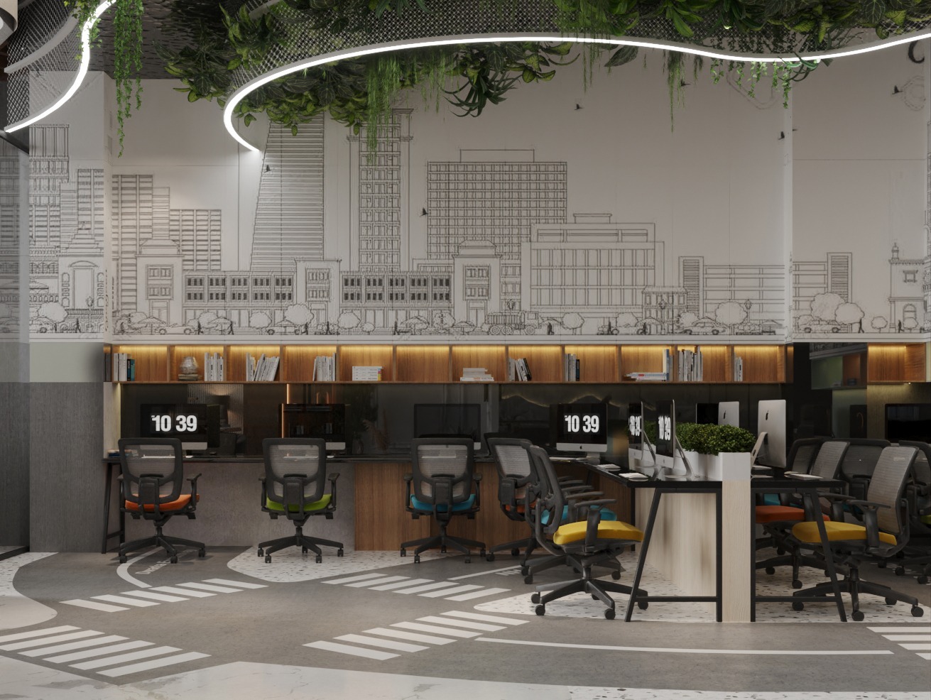 A bold ceiling design with greenery and dynamic lighting adds energy, while the terrazzo flooring and custom graphics on the walls give the office a unique identity rooted in the city’s urban character. Workstations are vibrant and functional, with pops of color bringing warmth to the otherwise clean, modern palette.