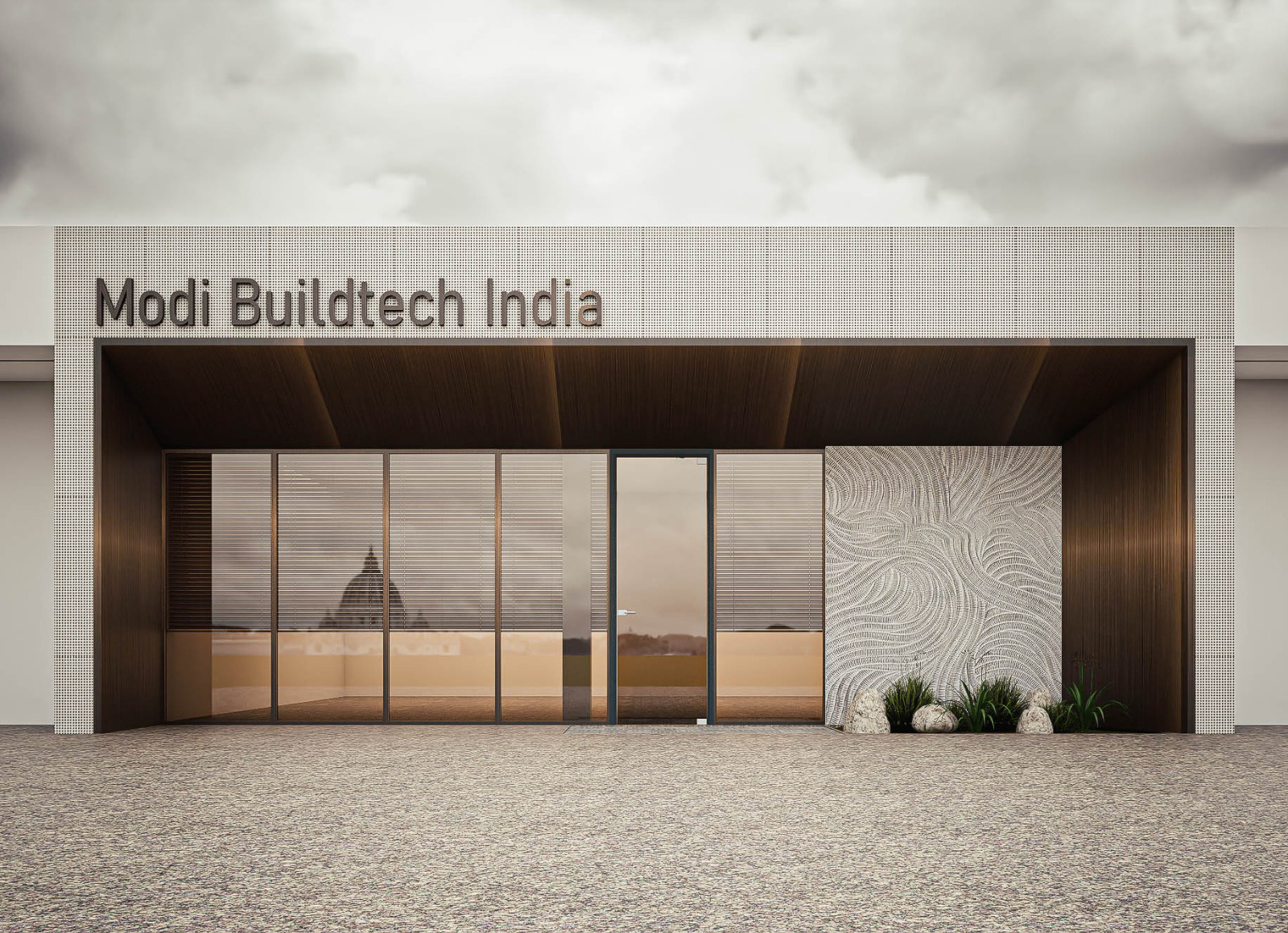 This 2,200 sq. ft. office in Faridabad was designed as a sleek and modern space for a real estate company. The facade sets the tone with its clean geometry, warm wooden accents, and a textured feature wall that adds depth and artistry to the entrance.